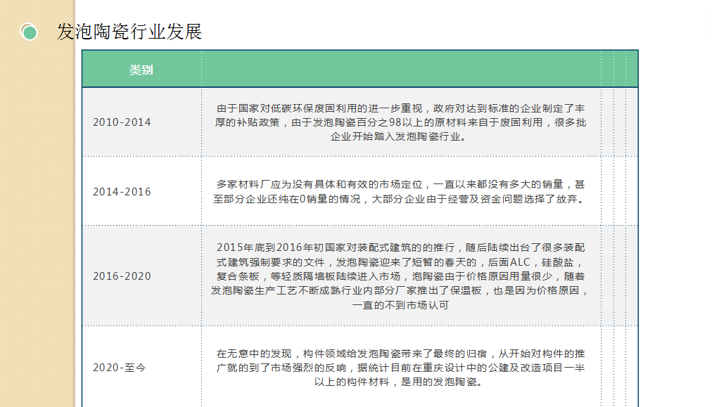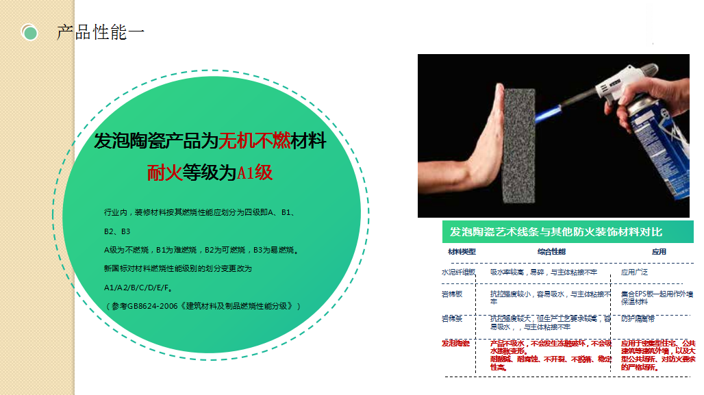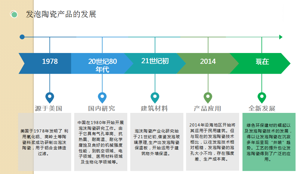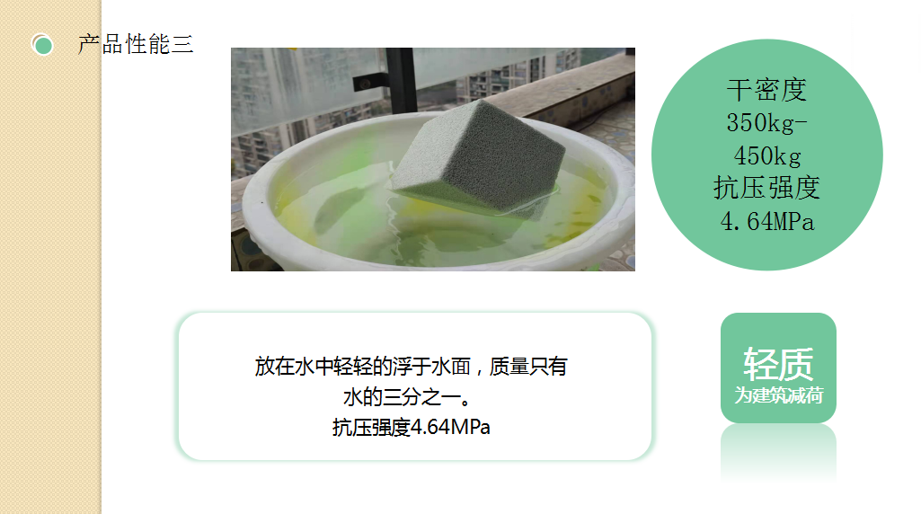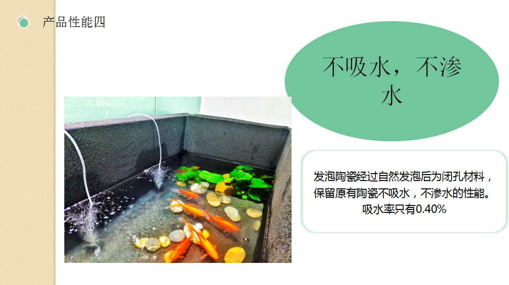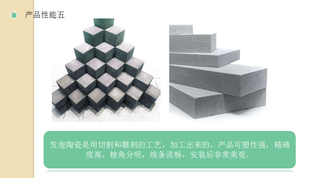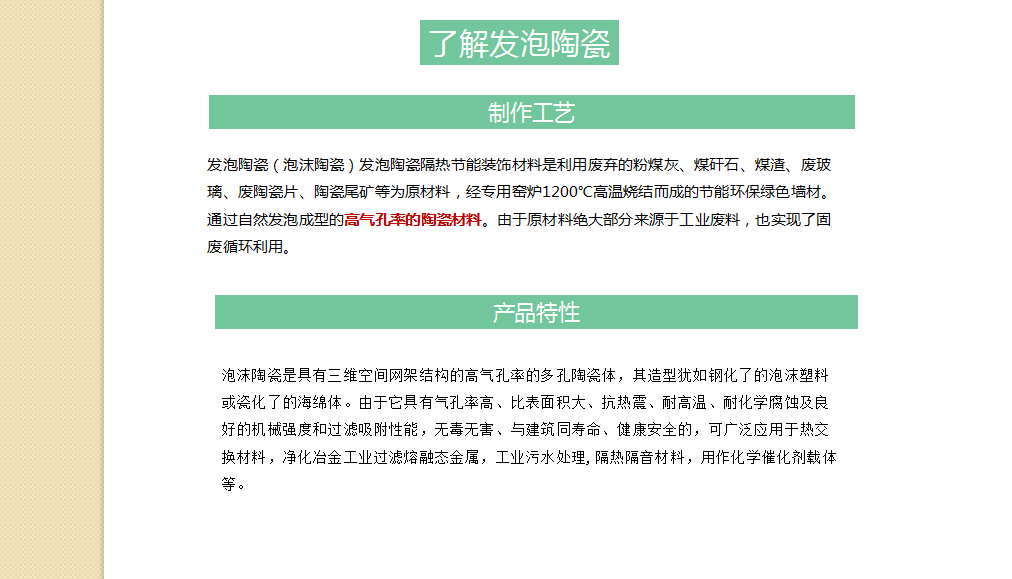 8.發(fā)泡陶瓷介紹:發(fā)泡陶瓷(泡沫陶瓷)發(fā)泡陶瓷隔熱節(jié)能裝飾材料是利用廢棄的粉煤灰、煤矸石、煤渣、廢玻璃、廢陶瓷片、陶瓷尾礦等為原材料,經(jīng)專用窯爐1200℃高溫燒結(jié)而成的節(jié)能環(huán)保綠色墻材。通過自然發(fā)泡成型的高氣孔率的陶瓷材料。由于原材料絕大部分來源于工業(yè)廢料,也實現(xiàn)了固廢循環(huán)利用。