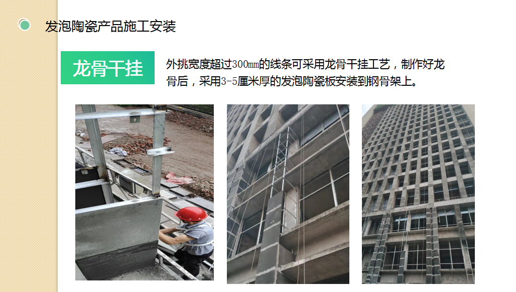 11.發(fā)泡陶瓷的安裝:目前在西南地區(qū)發(fā)泡陶瓷的施工銷售占有率已經(jīng)超過50百分之,也累計的大量的經(jīng)驗,更總結(jié)出來了一套完善的施工工藝(目前對材料的選擇,龍骨的制作,龍骨的大小,安裝的工序要求等一系列的工藝都都企業(yè)自身的標準)