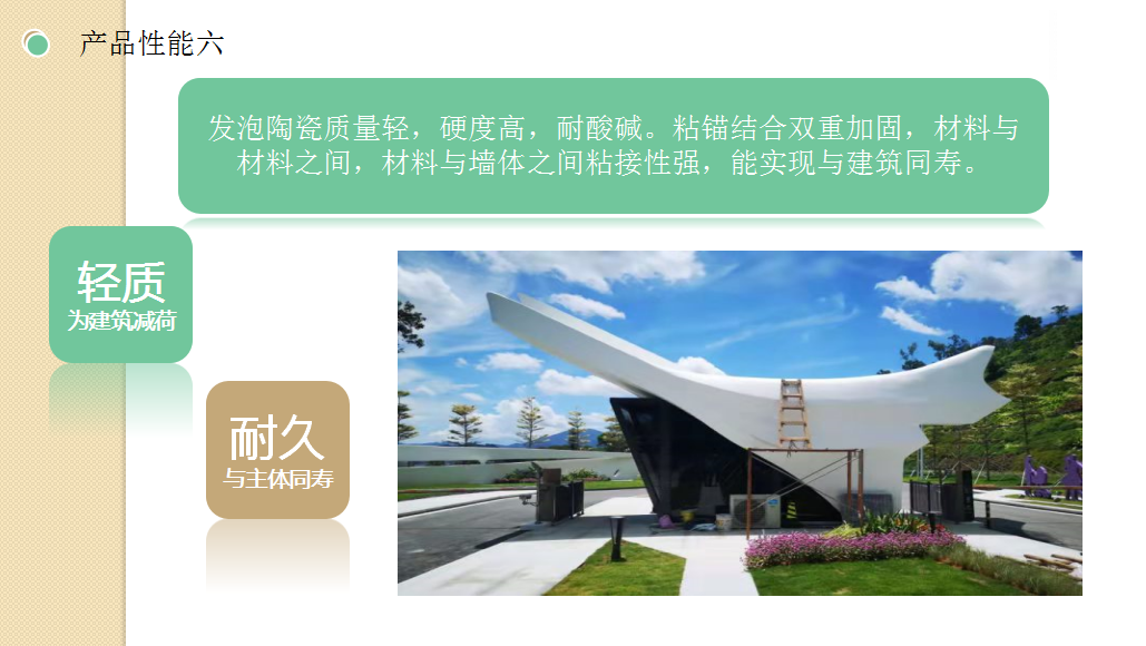 12.材料優(yōu)勢:本公司針對市場推出了高、中、低三種不同硬度的發(fā)泡陶瓷產(chǎn)品。干掛用發(fā)泡陶瓷板用高硬度的發(fā)泡陶瓷可以增加建筑的安全性,耐久性,運輸和安裝過程中的損耗。