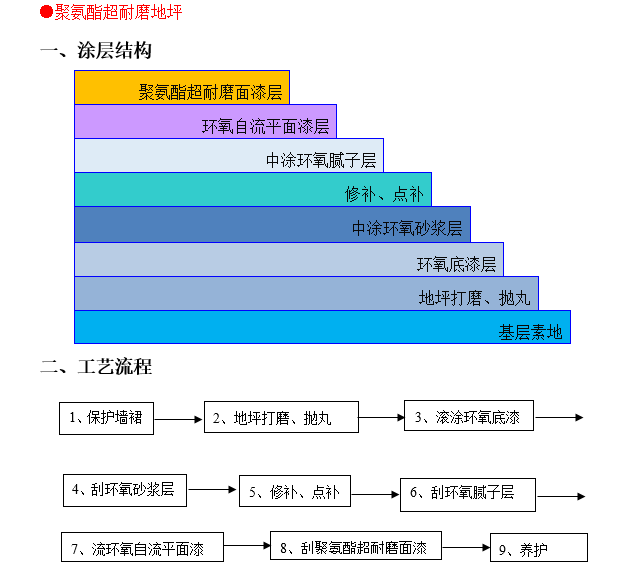 聚氨酯超耐磨免漆層、環(huán)氧自流平面漆層、中涂環(huán)氧膩子層、修補、點補、中涂環(huán)氧砂漿層、環(huán)氧底漆層、地坪打磨、拋丸、基層素地
